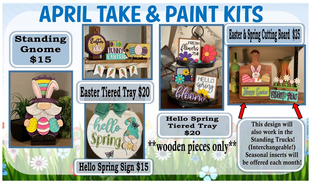 Here are the kits for April! The cutting board is new – it is an interchangeable! I will have new seasonal inserts for it as well! This month it comes with 2! Easter and Spring! It also has a built in easel – easy to put together ![]()