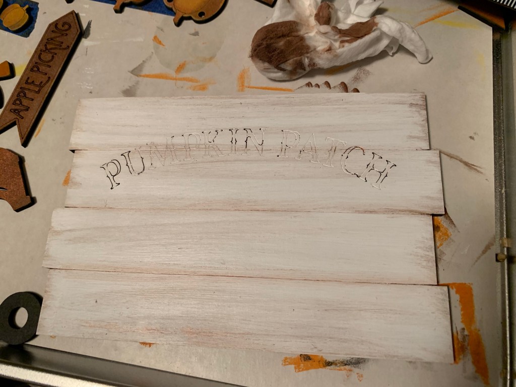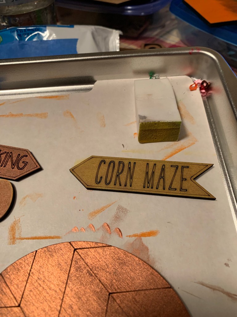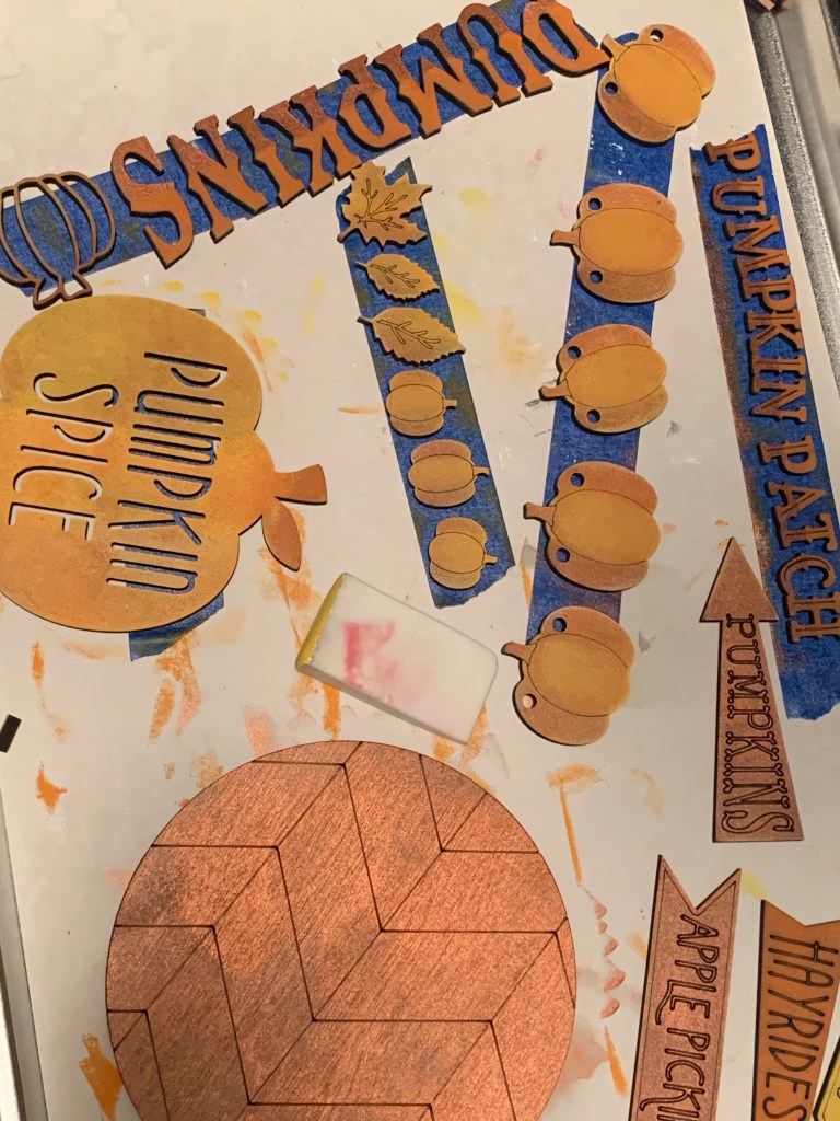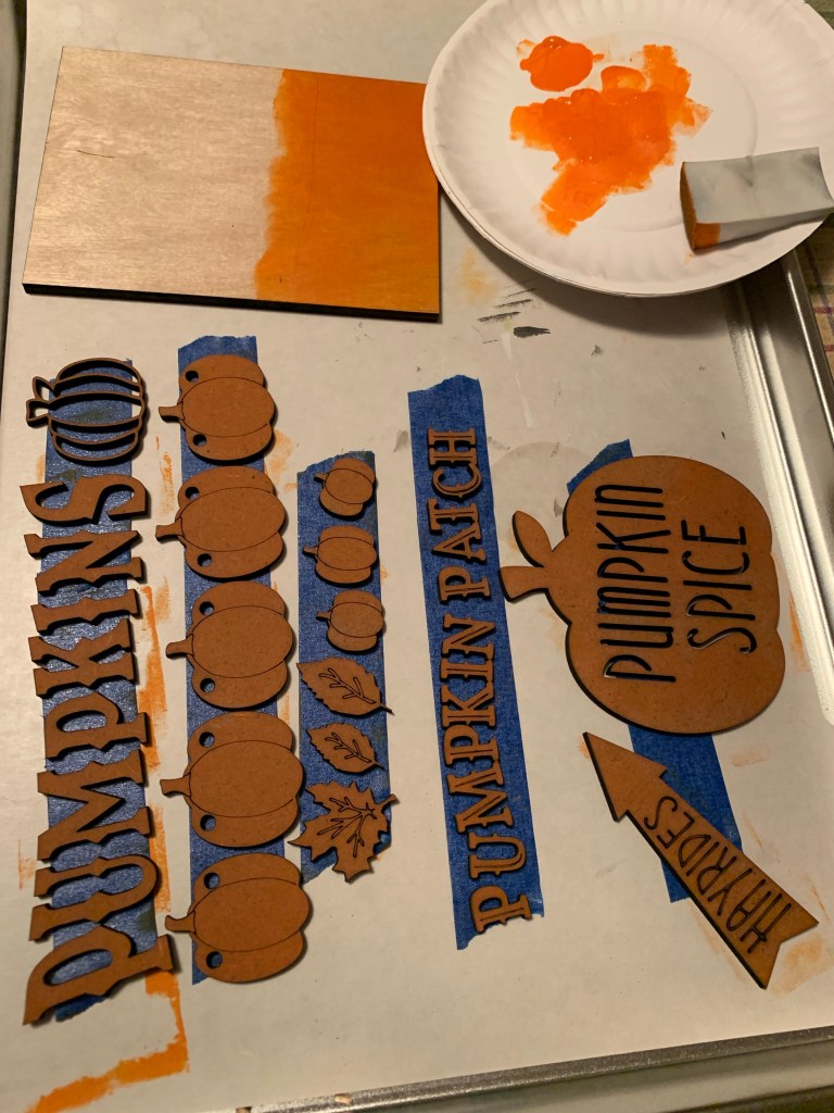 Here are some tips that help with painting. We put small letters and pieces on masking tape and paint away. All of the red items go on one piece of tape, all the white on another… makes them easier to paint. We also use both brushes and makeup sponges!